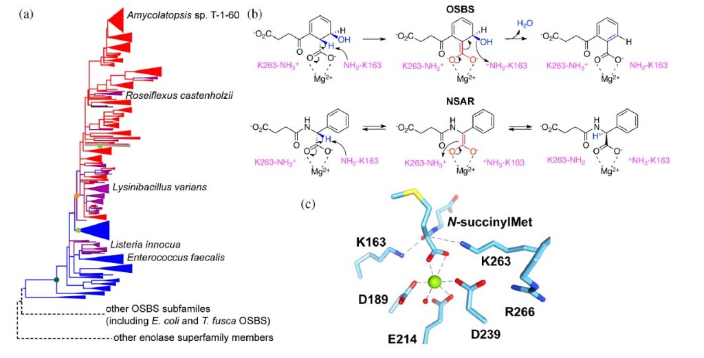 “Comparison of Alicyclobacillus acidocaldarius o‑Succinylbenzoate Synthase to Its Promiscuous N‑Succinylamino Acid Racemase/o‑Succinylbenzoate Synthase Relatives” Denis Odokonyero, Andrew W. McMillan, Udupi A. Ramagopal, Rafael Toro, Dat P. Truong, Mingzhao Zhu, Mariana S. Lopez, Belema Somiari, Meghann Herman, Asma Aziz, Jeffrey B. Bonanno, Kenneth G. Hull, Stephen K. Burley, Daniel Romo, Steven C. Almo, and Margaret E. Glasner Biochemistry 2018, 57(26), 3676-3689. Link: https://pubs.acs.org/doi/full/10.1021/acs.biochem.8b00088